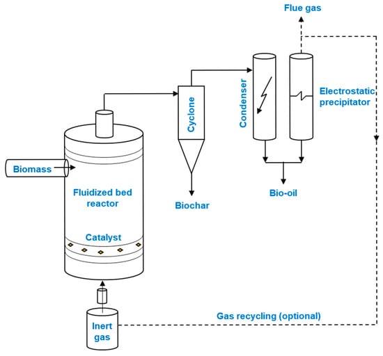Fast pyrolysis can generate between 60 wt% and 75 wt% of liquid products, 15 wt% to 25 wt% of biochar, and 10 wt% to 20 wt% of non-condensable gaseous products [31,45]. Biomass particle size also impacts the yields of fast pyrolysis products. Biomass particles smaller than 2 mm tend to favor the production of bio-oil and gas, while particles with a size up to 10 mm increase the yield of biochar, considering a study carried out at 500 °C and a residence time of 3 min using waste biomass [51]. Hence, it becomes relevant to consider optimizing biomass particle size to maximize the efficiency of the fast pyrolysis process. Among other parameters of the fast pyrolysis process, the volume of fluidizing gas, such as nitrogen, affects both the temperature distribution and heat transfer in the reactor, which directly influences the yield of the products. A higher inert gas flow rate leads to a short vapor residence time. In addition, if the biomass feed rate is too fast, it may reduce biomass conversion, negatively affecting bio-oil yield, which may incur high energy requirements for preheating and system operation [54].