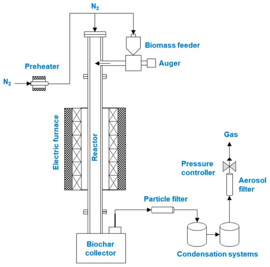 A study by Vieira et al. [27] evaluated the effects of different heating rates (i.e., 5, 10, and 20 °C/min) on biochar and bio-oil yields. An increase in the heating rate affected the quantity of volatile matter released, influencing the final products. In addition, the optimal temperature to maximize biochar yield was 450 °C. At higher temperatures, the release of volatiles increases, which reduces the biochar yield while improving its thermal stability [28]. A longer contact time between the solid and gaseous phases, attributed to longer reaction time, allows for the repolymerization of tar vapors, thereby increasing the biochar yield [29]. Consequently, at reduced temperatures and controlled heating rates, the chemical bonds of the biomass are disassembled, reorganizing the matrix into a more stable configuration that prevents the generation of volatile vapors [20]. Another study reported that increasing the N2 gas flow rate from 5 mL/min to 400 mL/min decreased the biochar yield from different feedstocks because the volatiles, as they were generated, were immediately pushed to the condenser by the high N2 flow rate, resulting in rapid condensation and bio-oil production [29]. This rapid condensation of volatile vapors increased bio-oil yields and reduced secondary polymerization reactions, leading to lower biochar production.