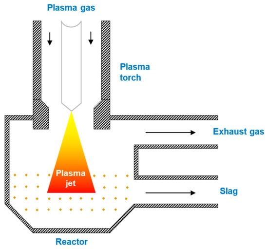 High-efficiency and rapid thermal degradation of robust solid waste is achieved in a plasma reactor by utilizing plasma’s thermochemical capabilities. In plasma pyrolysis, carbonaceous materials are processed under limited oxygen to produce a solid and gaseous product at an elevated temperature [87]. Figure 4 illustrates the schematics of a typical plasma reactor used for pyrolysis. The reactor utilizes high-energy plasma to convert biomass and waste into valuable products. Gas plasma is formed by applying a strong electric field, creating a highly ionized state with high temperatures [88]. This tremendous heat breaks down complex organic molecules into gases, bio-oil, and biochar with negligible emissions. Plasma pyrolysis can remediate contaminated feedstocks and boost conversion efficiency due to its unique circumstances.