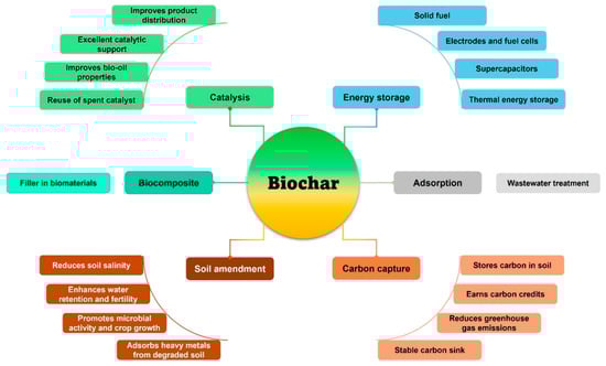 Diverse applications of biochar obtained from pyrolysis.