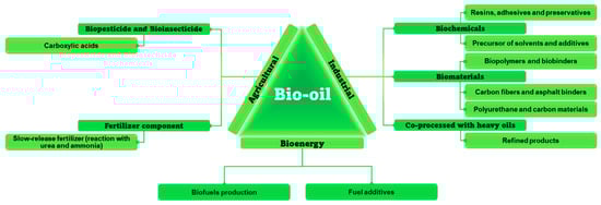 The carboxylic acids present in the aqueous phase of bio-oil can be extracted for use in agriculture as a precursor for biopesticides, bioinsecticides, and plant growth promoters [143]. Furthermore, bio-oil can be an additive for preparing slow-release fertilizers for agricultural applications, especially by reacting with ammonia and urea [144]. This combination generates a product with enhanced fuel stability, improved physical and chemical properties, higher density, and calorific value, while mitigating other unfavorable properties such as corrosiveness and susceptibility to aging [110]. Another bio-oil option is that obtained from polystyrene pyrolysis. Although not derived from organic sources such as biomass, it can be used as an additive in fuels, for example, in heavy fuel oil, thereby improving its fluidity and reducing the need for additional heat during pumping. Furthermore, its composition, rich in hydrocarbons, makes it useful in fuel mixtures and as a chemical industry solvent [141].