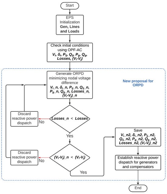 In the first case, an OPF-AC analysis is performed, and active power dispatch is carried out. The results of this analysis are used as a starting point to verify the efficiency of the proposed methodology. In the second case, an ORPD minimizes EPS losses and represents an optimization challenge to regulate EPS operation. Its objective is to minimize power losses and ensure that generators operate within the specified limits. It focuses on improving the operation of the electrical system, ensuring that generators operate safely within their limits, and simplifying node voltage regulation, compensation device dispatch, transformer operation, and service quality at load nodes. It reduces energy losses and provides an adequate voltage profile at the system nodes, allowing generators to produce or consume reactive power according to their rated capacities. The results of the first and second cases are used for the third case, the suggested method, in which a new optimization is performed based on minimizing voltage variations at the system nodes. A new optimization is carried out to ensure that the voltage levels at the system nodes are optimal, improving voltage profiles and reconfiguring losses and power flow, introducing a new approach to planning reactive power dispatch with optimal voltage levels in the system, which reduces power losses and produces a more efficient and balanced system.
