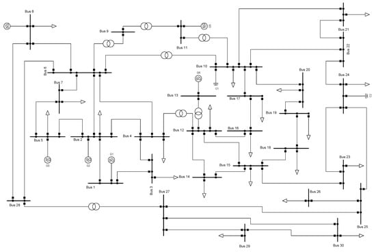 The proposed methodology was tested on the IEEE 30-bus test system, which consists of six generators connected to buses 1, 2, 5, 11, and 13. At the same time, it has 41 links, 34 referring to transmission lines, and the remaining 7 to transformers. In addition, two sets of parallel capacitors are connected to buses 10 and 24, providing characteristics of 0.3 p.u. Figure 3 shows the single-line diagram of the test system considered for this research. Table A1, Table A2 and Table A3 in Appendix A contain the EPS data.