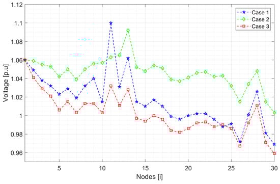 By minimizing power losses, their voltage profiles increase compared to the others, since active power losses are minimized and compensation elements not considered in the case of the OPF-AC are included, due to the very fact of compensation performed by the capacitor banks connected to busbars 10 and 24. Finally, by applying the proposed method, the voltage profiles decrease considerably and remain within range compared to the OPF-AC, and the minimization of losses in the system. According to the results analyzed in Figure 4, it can be observed that in case 1, by not improving or optimizing any technical variables or considering capacitor banks, the voltage profiles show very pronounced variations compared to the other cases, where technical parameters such as the reduction in active power losses are improved, as well as the inclusion of capacitor banks that help improve the SEP voltage profiles.