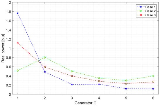 Figure 5 shows the active energy dispatches, presenting the same energy generation for cases 1 and 3, with generator 1 supplying more active power to the system. However, when losses are minimized in case 2, generator 2 provides the most active power. In case 3, generator 1 again provides the most energy; however, generation is lower than in cases 1 and 3, so the other generators generate more power, allowing us to balance losses.