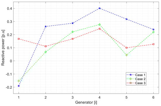 Figure 6 shows that in case 1, the generators increase their reactive power in most cases without reactive power compensation elements. Regarding the reactive power compensation considered in cases 2 and 3 according to Table 2, capacitor bank one connected to busbar 10 compensates more reactive power when losses are minimized and less reactive power when voltages are minimized, while in case 3, the compensation is in the range of case 1. There is a pronounced variation for capacitor bank two connected to busbar 24. Controlling the reactive power dispatch of the capacitive compensators at nodes 10 and 24 in case 3 compared to case 1, the reactive power produced through the generators can be reduced, as shown in Figure 6.