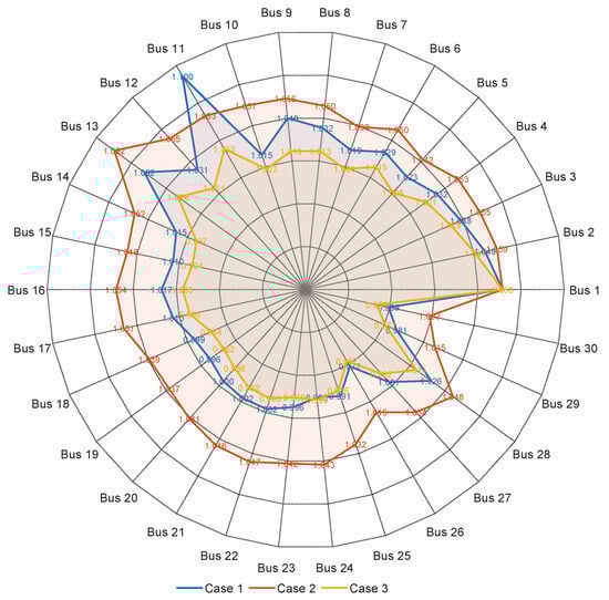 Voltage profile across all nodes for three operational cases: OPF-AC (Case 1), loss minimization (Case 2), and a constrained scenario (Case 3).