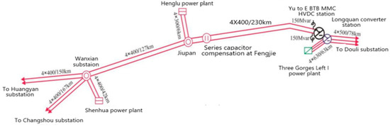 The north channel of the Chongqing–Hubei back-to-back MMC HVDC project has a rated voltage of ±420 kV and a rated power of 2500 MW. Two converters operate in parallel, each with a rated power of 1250 MW, and can operate independently. The Chongqing side is connected to the Chongqing power grid through two 500 kV lines from Chongqing Jiupan to Hubei Yichang, with a line length of 230 km. A series compensation device is installed near the Jiupan side of the line. The intensity of the AC system is relatively weak, and the short-circuit current is at a relatively low level. When there are N-2 faults in different components or N-1 faults in the maintenance mode of the near-area lines, series compensation, and generator units, the short-circuit current on the system side will be lower than the boundary conditions determined in the project feasibility study stage, and the Chongqing side will access weak system mode. Reference [13] provides detailed system calculations, which will not be elaborated here. The power grid structure diagram on the Chongqing side is shown in Figure 2.