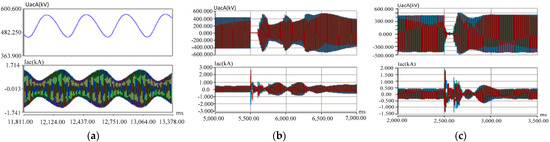 Simulation calculation results when exceeding the limit operation and low-power operation in weak system mode. (a) Normal control strategy: in a weak system, the transmission power exceeding the limit leads to the oscillation of the AC voltage and current. (b) Normal control strategy, 500 MW from Chongqing to Hubei, three-phase grounding instantaneous fault, converter voltage, and current waveforms. (c) Weak system control strategy, 500 MW transmission from Chongqing to Hubei, three-phase grounding instantaneous fault, converter voltage, and current waveforms. From top to bottom: Phase A voltage, three-phase current (Phase A—blue, Phase B—red, Phase C—green).