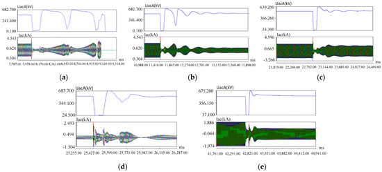 Simulation test results before and after the optimization of the weak system control strategy. (a) The normal control strategy, three-phase instantaneous ground fault simulation, and the system trips and blocks in the weak system mode. (b) AC voltage controller parameters under weak system conditions (kp = 2, ki = 10). (c) Control parameters of inner loop current controller under weak system conditions (kp = 0.4). (d) Control of DC voltage on the Hubei side. (e) High-power operation, weak system mode, and limited active power. Each figure, from top to bottom: Phase A voltage, three-phase current (Phase A—blue, Phase B—red, Phase C—green).