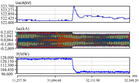 Through the above mentioned simulation calculation and simulation experiment research, the control strategy of the MMC HVDC in the weak system mode was obtained. These control strategies were applied to the Chongqing–Hubei MMC HVDC back-to-back project and were verified through on-site tests. The process is as follows: The flexible DC dual converter units are in operation. The DC power from the Chongqing side to the Hubei side is 250 MW. A situation in which all the units of the Henglu power plant are out of operation is simulated, and the Chongqing side switches to the weak system mode. The DC power drops rapidly by 100 MW, and each converter unit reduces power by 50 MW. The voltage, current, and transmission power of the converter unit I on the Chongqing side are shown in Figure 5.