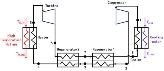 As shown in Figure 1, the system studied is a recuperative Brayton cycle which consists of heat exchange components, including a heater, a cooler, and two recuperators, as well as turbomachinery components, comprising a compressor and a turbine. In this system, the working fluid is pressurized from the low-pressure state to the high-pressure state by the compressor. Subsequently, it sequentially passes through the two recuperators, where it is preheated using the heat from the exhaust gas. The working fluid is then further heated to the maximum system temperature in the heater before entering the turbine, where it expands to the low-pressure state, performing work. After expansion, the fluid returns to the two recuperators for pre-cooling before being further cooled in the cooler to reach the minimum system temperature. Finally, the working fluid is directed back to the compressor, thus completing one full thermodynamic cycle.