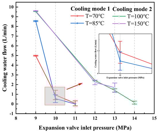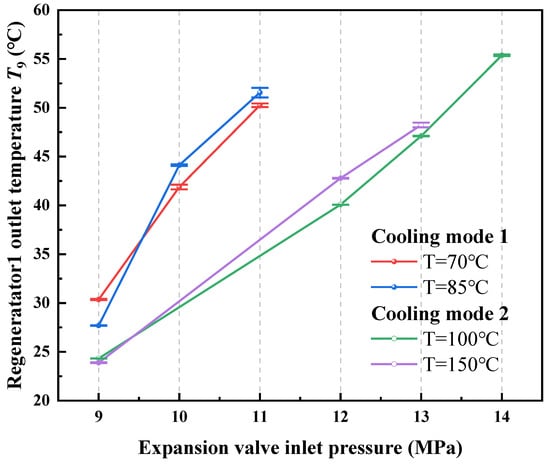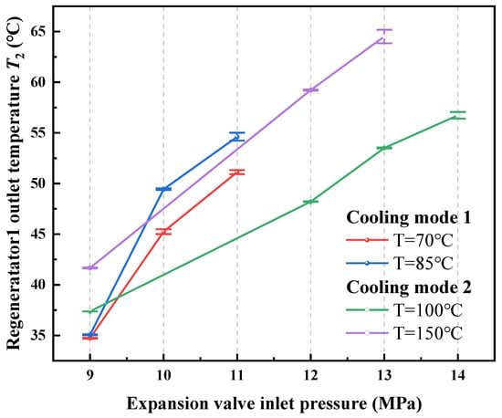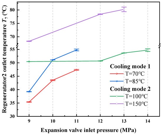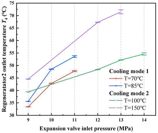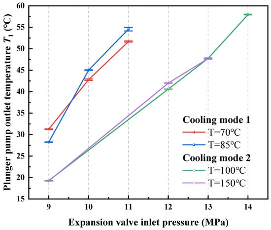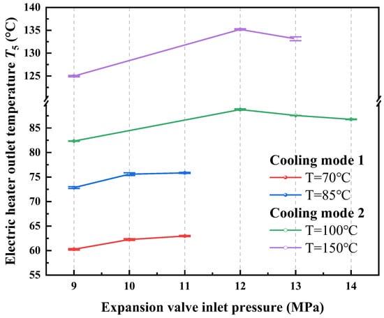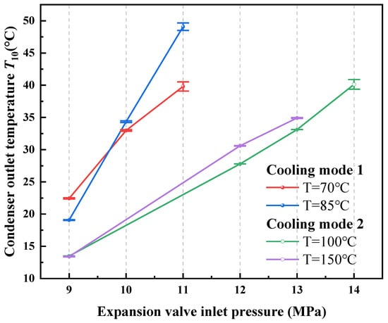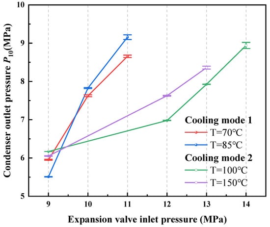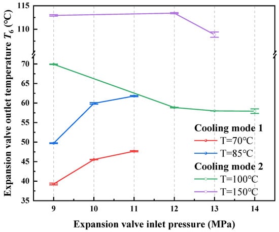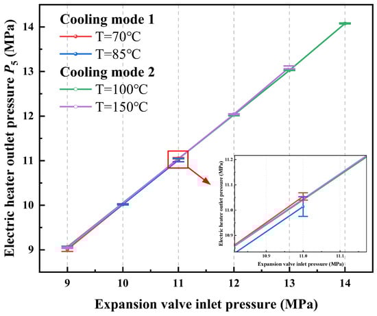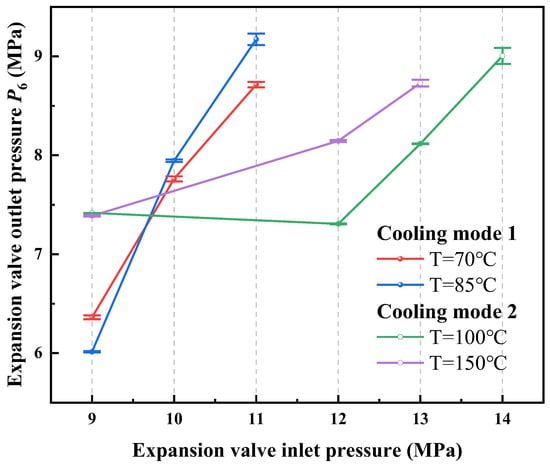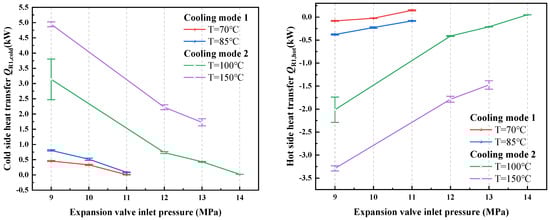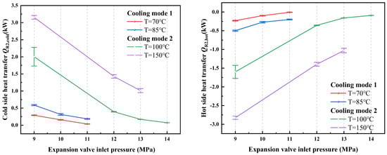 For most high-temperature points, the measured temperature increases with increasing expansion valve inlet pressure, following a consistent trend. However, a notable exception is observed for the temperature at the expansion valve outlet point in Cooling Mode 2. In this case, the temperature decreases as the expansion valve inlet pressure increased. This phenomenon is attributed to the significant increase in pressure difference across the expansion valve in Cooling Mode 2. As analyzed in previous sections, the pressure drop across the expansion valve increased significantly with inlet pressure, reaching a maximum of approximately 4 MPa. This higher pressure drop enhances the expansion cooling effect, leading to a reduction in temperature at the expansion valve outlet point.