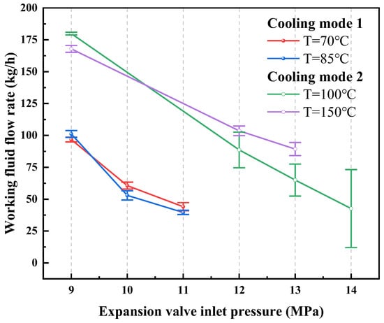 The trend of the working fluid flow rate under different steady-state conditions is shown in Figure 5. It is first observed that the two data groups, Cooling Mode 1 and Cooling Mode 2, exhibited noticeable differences in their flow rate trends, which corresponded to the variation in cooling water flow rate adjustment range. Specifically, a larger adjustment range of cooling water flow rate is associated with a broader range of working fluid flow rate variation.
