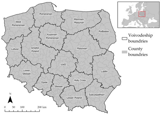 The spatial extent of the analysis—voivodeships of Poland. Source: own elaboration using ArcGIS Pro 3.4 with data from the Polish Register of Borders.