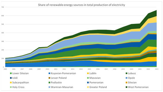Changes in the share of renewable energy in total electricity production in Poland’s voivodeships, in the years 2005–2023. Source: own elaboration.