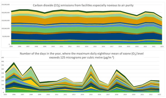 - V2—number of days in the year, where the maximum daily eight-hour mean of ozone (O3) level exceeds 125 micrograms per cubic meter (µg/m3) [78,79,80].