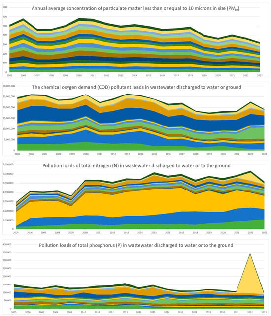 The process of testing the collinearity of the explanatory variables was completed, leaving six such variables in the model: carbon dioxide (CO2) emissions from facilities especially noxious to air purity; number of days in the year, where the maximum daily eight-hour mean of ozone (O3) level exceeds 125 micrograms per cubic meter (µg/m3); annual average concentration of particulate matter less than or equal to 10 microns in size (PM10); the chemical oxygen demand (COD) pollutant loads in wastewater discharged to water or ground. COD is an indicative measure of the amount of oxygen that can be consumed by reactions in a measured solution. The most common application of COD is in quantifying the amount of oxidizable pollutants found in surface water (e.g., lakes and rivers) or wastewater; pollution loads of total nitrogen (N) in wastewater discharged to water or the ground; pollution loads of total phosphorus (P) in wastewater discharged to water or to the ground (the process itself is described in detail step by step in the Section 3). The first half of the explanatory variables relates to air pollution, while the second half relates to water or ground pollution. Thus, it was possible to reject the null hypothesis and continue the study. Thus prepared, the model was used to evaluate the transition from brown to green energy in the context of the Environmental Dimension of Sustainable Development in Poland, in the years 2005–2023.