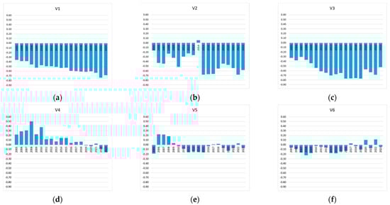 For all analyzed variables, the coefficient values fall in the range <−0.77; 0.50>. Of the 114 values (6 variables, 19 years), as many as 88 are negative—this indicates a general trend of inverse (or negative) correlation. Most of the coefficients indicate weak correlation (62 in total), but this is mainly observed for variables V4–V6, i.e., describing pollution of water and ground (56 coefficients). Moderate correlation is indicated by 47 coefficients, almost all for variables describing air pollution (46 coefficients, for variables V1–V3). The remaining 5 coefficients indicate a strong correlation (4 for variable V3, 1 for variable V1). The results suggest a weak correlation of water and ground pollution, while a negative moderate and negative strong correlation for the air pollution variables. In order to better illustrate the results, the data are presented in the column graphs below (Figure 5). The axes of the charts have been unified to allow comparison of the results.
