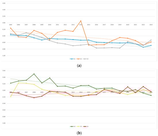 The column graphs illustrate changes in values over time. Pearson’s correlation coefficient values for most variables are gradually decreasing. Changes for variables V1–V3 are lower and more stabilized—values are successively decreasing. For variables V4–V6, the situation is more dynamic, with values increasing and decreasing by different ranges. In order to look for trends in the changes in the studied phenomenon, it was decided to combine the data thematically into variables describing air pollution (V1–V3) and variables describing water and ground pollution (V4–V6) in two separate line graphs, which are presented in Figure 6.