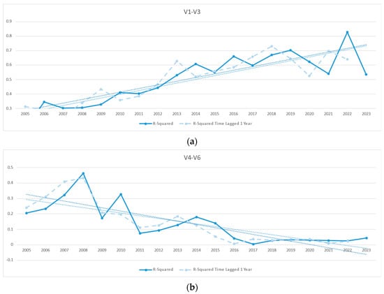 Changes in the Pearson’s correlation coefficient over time, for variables V1–V3 (a), and variables V4–V6 (b). Source: own elaboration.