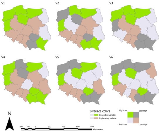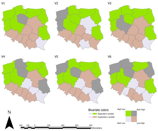 In addition, a study of spatial variation was also carried out using GIS tools, in the form of a series of maps visualized using the bivariate colors method. This method visualizes the quantitative relationship between two variables by using a dual-color scheme to visually compare, emphasize, or delineate values. The 2 × 2 grid used in the study allows the map to be divided into four classes: high–high, low–low, high–low, and low–high. The first two cases indicate high and low values of the two variables analyzed, respectively. The high–low and low–high classes present situations where one of the analyzed variables is high and the other is low. Bivariate color mapping is especially effective for identifying extremes and spatial correlations, as well as for uncovering local variations in the studied phenomena.