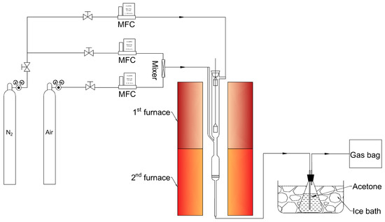 The oxidative pyrolysis of biomass volatile model compounds was conducted in a two-stage quartz-tube reaction system, as shown in Figure 1. It consisted of a gas supply system, a two-stage quartz-tube reactor heated by an electric furnace, a condensation system, and a gas collection bag. The gas supply system mainly provided two gas streams into the reactor, including the carrier gas N2 and the oxygen-containing oxidation gas. The carrier gas N2 was injected into the reactor from the top with a flow rate of 250 mL/min. The oxidation gas was a mixture of N2 and air with a total flow rate of 50 mL/min; it was injected into the reactor from the middle (between the upper and lower sections). The amount of oxygen introduced was controlled by the mass flow controller (MFC). It should be noted that the gas flows did not require preheating due to their low flow rate compared with the large power of the two electric furnaces (both 1.5 kW); insignificant temperature fluctuations were observed during the experiments as the gases were easily heated to the reaction temperature. The quartz-tube reactor featured an inner diameter of 38 mm, with the lengths of the upper and lower sections being 330 mm and 122 mm, respectively. These two sections were heated separately by two independent electric furnaces (both 1.5 kW) and maintained at different temperatures. The upper section was used to evaporate the volatile model compounds; the temperature was set at 200 °C for furfural and hydroxyacetone and 250 °C for 3,4-dimethoxybenzaldehyde, according to their volatilization temperatures. The lower section was used to oxidize the volatilized model compounds at a lower oxygen ER, and its temperature was set at 400 or 500 °C, which was identical to the oxidative pyrolysis temperature. To ensure the precise control of the temperatures in each section and minimize the mutual influence of both sections due to the large temperature gradient, Kaowool was used to isolate the furnace/reactor from the environment (reducing heat loss) and the upper section from the lower section of the reactor (minimizing mutual influence). The top, middle, and bottom of the furnace/reactor were all well insulated. A K-type thermocouple penetrating through the top rubber plug of the reactor was used to measure the temperatures of both the sections. It should be pointed out that the temperatures given above were the actual measured temperatures, which were normally 8 °C lower than the set temperatures of the electric furnaces. Pre-experiments proved that the temperatures of the two sections could be controlled independently and kept steady over the experimental timescale. The condensation system was made of an acetone (AR) washing bottle immersed in an ice bath to capture the condensable products.