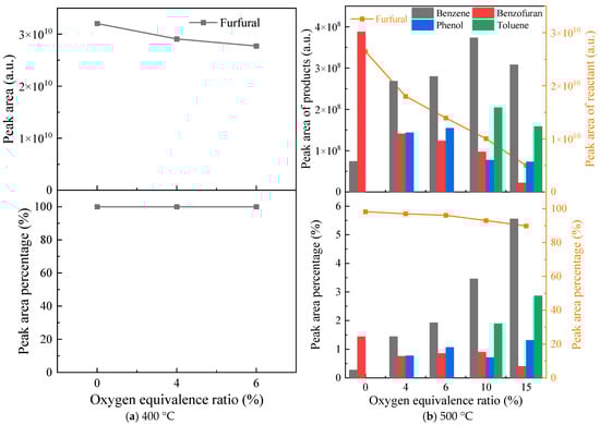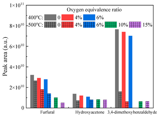 Figure 5 shows the peak areas of the three volatile model compounds in the products after oxidative pyrolysis under low oxygen ERs of 0–15% at 400–500 °C. The data were gathered from the above sections, with a focus on the comparison of the conversion rate of different compounds during oxidative pyrolysis under different operation conditions. It should be pointed out that the peak areas of different compounds do not represent the amount of such compounds, as the response factors (peak area to weight percentage) for different compounds vary largely. For instance, the volatilization of 3,4-dimethoxybenzaldehyde (22.33 wt.%) was largely lower than that of furfural (100 wt.%), but the peak area of 3,4-dimethoxybenzaldehyde in the product was greatly higher than that of furfural with less of both being decomposed under a non-oxidative atmosphere at 400 °C. But, for the same compound, the peak area can be used to compare the amounts of the compound obtained under different conditions.