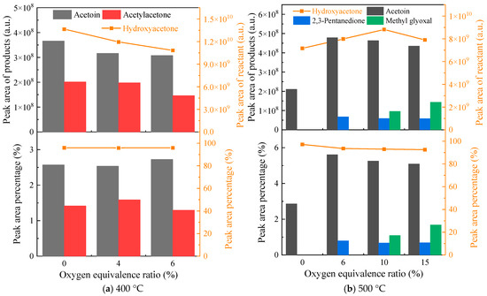 Figure 3 shows the composition of products detected by GC-MS from the oxidative pyrolysis of hydroxyacetone under oxygen ERs of 0–15% at 400 and 500 °C. From Figure 3a, it can be seen that, at 400 °C, with the increasing ER, the peak area of hydroxyacetone decreased, indicating the promoted thermal decomposition/oxidation of hydroxyacetone in the presence of oxygen. But the peak areas of acetoin and acetylacetone also decreased, demonstrating that the decomposition of hydroxyacetone mainly generated permanent gases rather than condensable liquid products. The hydroxyacetone in the liquid product still accounted for ~96%, which was largely higher than the other products, showing the limited decomposition rate at 400 °C. From the perspective of liquid product composition, acetoin and acetylacetone were the major products from both non-oxidative and oxidative pyrolysis of hydroxyacetone. It might be inferred that hydroxyacetone (CH3COCH2OH) might undergo C-C and C-O cleavages to form CH3CO, CH3COCH2, and CH2OH intermediates, while (1) two CH3CO would be coupled to form CH3COCOCH3, with one of the C=O bonds hydrogenated (with H radical) to form acetoin (CH3COCHOHCH3), and (2) CH3CO and CH3COCH2 might also be coupled to form acetylacetone (CH3COCH2COCH3). Although the presence of oxygen enhanced the cleavages of C-C and C-O bonds (illustrated by the decreased hydroxyacetone peak area), the coupling of the intermediates was inhibited with the decreased acetoin and acetylacetone under the oxidative atmosphere. It means that the further decomposition of these intermediates under an oxidative atmosphere might be strengthened with CO, CO2, and hydrocarbon gases such as CH4 releasing.