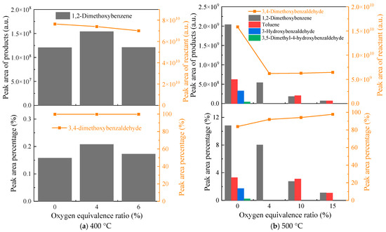Figure 4 shows the composition of products detected by GC-MS from the oxidative pyrolysis of 3,4-dimethoxybenzaldehyde under oxygen ERs of 0–15% at 400 and 500 °C. From Figure 4a, it can be observed that the oxidative pyrolysis of 3,4-dimethoxybenzaldehyde only detected one product, i.e., 1,2-dimethoxybenzene, with the majority of the compound still being 3,4-dimethoxybenzaldehyde (~99.8%) at 400 °C. Although the presence of oxygen promoted the decomposition of 3,4-dimethoxybenzaldehyde with the observed decrease in the GC-MS peak area, the decomposition rate was not high, with a very low amount of 1,2-dimethoxybenzene formation. The content of 1,2-dimethoxybenzene even decreased at an ER of 6%, indicating that a higher ER might enhance the oxidation of these compounds to form permanent gases. The formation of 1,2-dimethoxybenzene (C6H4(OCH3)2) might be mainly due to the decarbonylation of the aldehyde (-CHO) group connected to the benzene ring (CHOC6H3(OCH3)2→C6H4(OCH3)2+CO), which might be enhanced in the presence of oxygen at a lower ER of 4%. But a higher ER might further oxidize it into permanent gases.