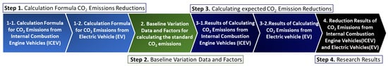 The research process was conducted in 4 stages. Step 1 is the CO2 emission reduction calculation formula-setting stage, Step 2 is the data and factor organization stage, Step 3 is the calculation stage, and Step 4 is the carbon reduction stage based on result production. The carbon reduction amounts of ICEVs and EVs were calculated, respectively. The research flow chart is summarized in Figure 2, and each detailed formula is as follows.