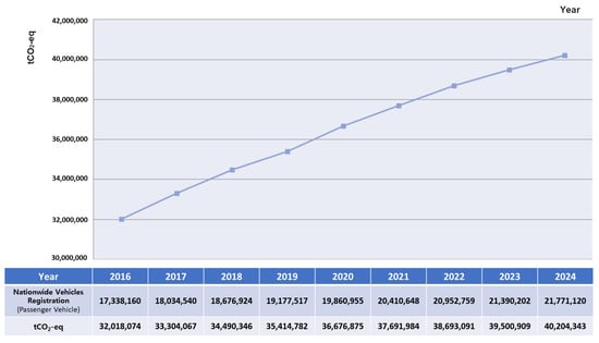 - Ministry of Land, Infrastructure and Transport. Total Registered Motor Vehicles. Available online: http://stat.molit.go.kr (accessed on 25 April 2025).
