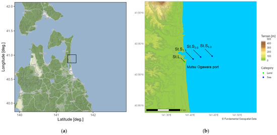 Location of the (a) North Tohoku area in Japan and (b) observation sites around Mutsu Ogawara Port. The black square in (a) indicates the area covered in (b). Source of (a): Konagaya et al. (2021) [3].