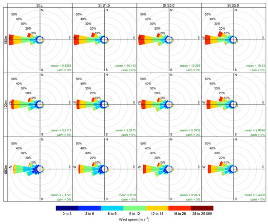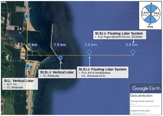 At St.L and St.S1.5, wind conditions were observed at 63, 120, and 180 m above the ground or sea level using Vaisala’s Windcube V2.1 LiDAR [31]. Offshore, the FLS used at St.S3.0 was an AXYS WindSentinel [32] equipped with a Vaisala Windcube V2.0. At St.S5.0, a Fugro SEAWATCH [33] equipped with a ZX LiDAR ZX300M [34] was deployed. The wind speed and direction data used in this study were 10 min averaged values obtained from certified Doppler LiDAR systems and are considered sufficiently reliable for model validation. While turbulence intensity estimation using LiDAR remains under development—particularly at higher altitudes—it is recognized as an important subject for future research [35]. Table 1 summarizes the instrument specifications, and Figure 3 illustrates the experimental setup.