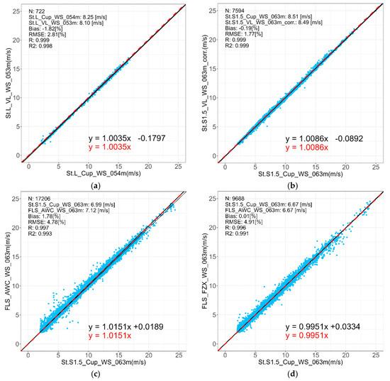 Accuracy verification results of the LiDAR devices used during the observation campaign, compared against reference data from nearby the meteorological masts. The LiDARs installed at each observation point are shown as follows: (a) St.L, (b) St.S1.5, (c) St.S3.0, and (d) St.S5.0. The values in the upper left corner of each panel indicate statistics from comparative verification of the two observation data sets.