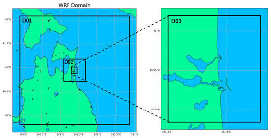 Table 3 and Figure 6 present the configurations and calculation domains of the mesoscale model used in this study. Three-stage nesting was implemented to achieve this resolution, allowing the mesoscale model to cover a much wider calculation domain than other models.