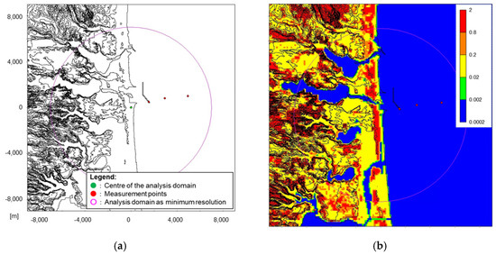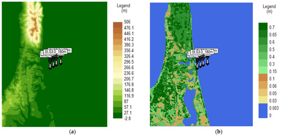The configurations and calculation domains of MASCOT are listed in Table 4 and illustrated in Figure 7a. Terrain data were derived from the 50 m digital elevation model [49] published by the Geographical Survey Institute. At the same time, roughness length information was generated using land use data provided by the Ministry of Land, Infrastructure, Transport, and Tourism [50] (Table 5). These configurations represent the default settings for the MASCOT analysis. The terrain distribution (Figure 7a) and roughness length map (Figure 7b) show that forested areas in complex terrain were prevalent across the land portion of the domain.