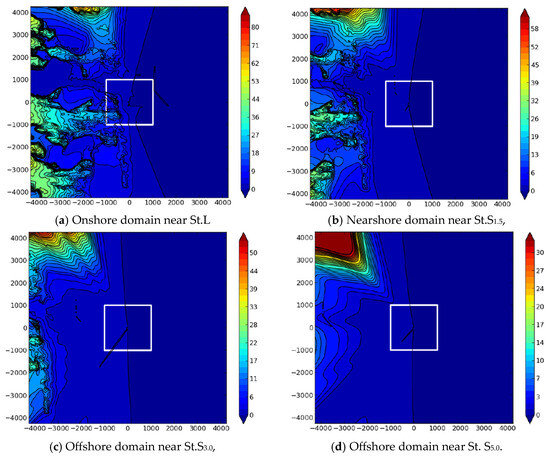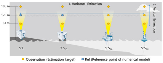 Wind conditions are often estimated based on observations at a single location. To reflect this practical approach, we adopted a method in which the data from one observation point served as a reference for estimating the surrounding offshore wind conditions using each numerical model. Specifically, we designated a reference point (Ref) for all the numerical models to provide model input or correction data. In the subsequent analysis, two types of Ref points were used for each numerical model: one located onshore (St.L) and the other located nearshore (St.S1.5). The wind speeds at the offshore points (St.S3.0 and St.S5.0) were estimated based on Refs. A blind method was applied during the numerical model estimations; that is, no observational data from the offshore points (St.S3.0 and St.S5.0) were excluded from the Ref.