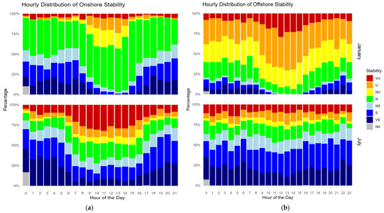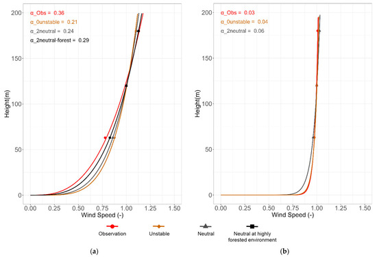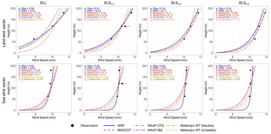 Stability calibration of Meteodyn WT™ at (a) land and (b) sea wind sectors. The numerical values shown in the upper left corner of each panel represent the power-law exponent (α), which indicates the magnitude of vertical wind shear.