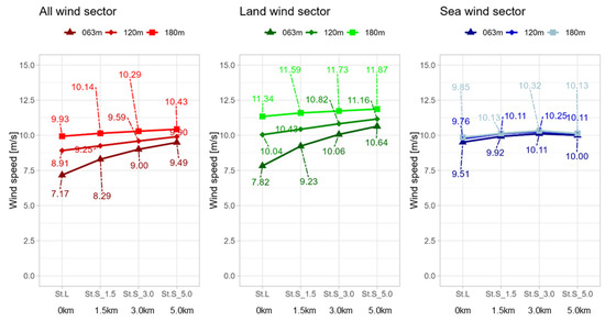 However, unlike the neutral conditions over land, offshore areas were dominated by unstable stratification. This led to an overestimation of vertical shear (α) values at offshore sites (St.S3.0, St.S5.0) by the numerical models. This overestimation suggests that the unstable sea surface thermally influences land-sector winds as they pass over it. Therefore, numerical models that incorporate atmospheric stability considerations similar to those used for sea sector winds are recommended even in coastal areas affected by land.