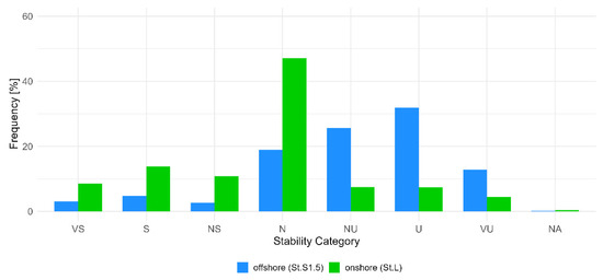 To evaluate atmospheric stability, which represents the degree of vertical mixing in the atmosphere, the Monin–Obukhov length (MOL) was used as an index to characterize atmospheric stability in the surface layer. In this study, the MOL was calculated at the onshore (St.L) and offshore (St.S1.5) sites using the eddy-covariance method, which directly derives the MOL from high-frequency momentum flux and vertical heat flux data. Ultrasonic anemometers were installed 56 m above the ground level at St.L and 61 m above sea level at St.S1.5 to ensure a homogeneous horizontal environment. The data obtained from these setups were used for the analysis.