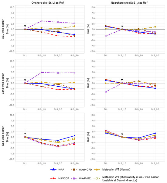 Mesoscale models that can incorporate the thermal conditions at each grid point over time are advantageous for capturing these variations. This advantage is reflected in the consistently high estimation accuracy of WRF in the coastal-to-offshore direction (Figure 18). However, the model tends to slightly underestimate the rate of wind speed increase for land-sector winds blowing offshore, suggesting that further improvements are needed to address dynamic factors such as surface roughness in nearshore areas [7].