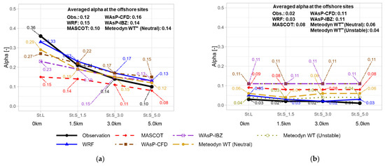 Power law exponent (α) of the wind speed profile derived from observations and numerical models: (a) land-sector wind and (b) sea-sector wind. The numerical values in the upper right corner of each panel represent the average α value at two offshore sites (St.S3.0, St.S5.0).