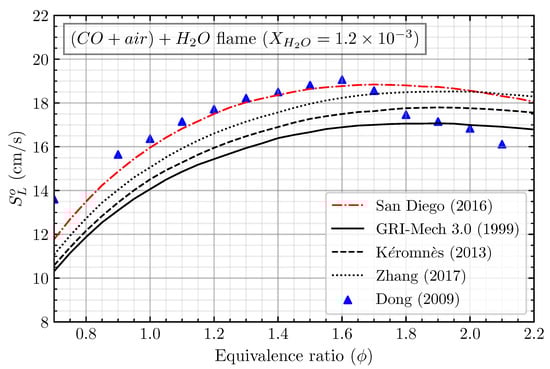 The mechanism validation was first conducted to ensure that the numerical settings and the used mechanism agreed well with the experimental data. Four different kinetic mechanisms, including the San Diego mechanism [], GRI-Mech 3.0 mechanism [], Kéromnès mechanism [], and Zhang mechanism [], were used to calculate the laminar flame speed of (CO/air) + H2O. The calculated laminar flame speed was then compared with the results of Dong et al. [], who experimented with the premixed CO/air flame at ambient conditions. It should be noted that, in the numerical simulation of CO/air flame, the solver can only solve the calculation when we treat it as wet carbon monoxide oxidation. Adding any hydrogenous species is necessary to initiate the solver to solve the numerical case of the CO/air flame. When burning carbon monoxide with air, the hydrogenous species may come from the presence of water vapor () in the air to form a humid air. Nevertheless, in the study of Dong et al. [], they did not specify the amount of , which can be estimated and validated using numerical simulation. The estimation of in the air was firstly conducted by comparing the numerical simulation of stoichiometric (CO/air) + flame with the available measured data by varying the from to . The measured laminar flame speed of CO/air first intersects with the calculated laminar flame speed at = . By these results, we extend the calculation of the laminar flame speed of CO/air flame with = with different equivalence ratios, as shown in Figure 1. The San Diego mechanism result agrees well with the experiment compared to the other mechanisms. The calculated laminar flame speed agrees well with the equivalence ratio between 0.9 and 1.6; meanwhile, it is mostly overestimated in the equivalence ratio lower than 0.9 and higher than 1.6. The discrepancy mainly comes from the uncertainty of the measurement in the lean and rich (CO/air) flame, owing to the lower laminar flame speed of that region. This result indicates that (CO/air) + 1.2 H2O can represent the CO/air flame. Furthermore, the San Diego mechanism will be used for the following analysis.