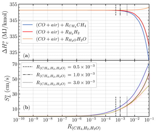 where represents the stoichiometric fuel to oxygen mole fraction of CO/air flame. The investigation involved a value of varied on , , and , which is close to the CO/air flame ((CO/air) + 1.2 H2O). The value of was varied from 0.5 to 4.0 to understand its effect on the wide range of equivalence ratios. It is worth mentioning that varying the from up to in the premixed CO/air flame will not significantly change mole fraction of the mixture. Also, the heat of combustion remains close to the CO/air flames (351 MJ/kmol) in different , as illustrated in Figure 2a. Therefore, the definition of the equivalence ratio in Equation (2) remains the same with the CO/air flame when a small amount of hydrogenous species is introduced to the mixture. The upstream temperature and pressure were set to 300 K, and one atmospheric pressure and all reactants were in the gas phase.