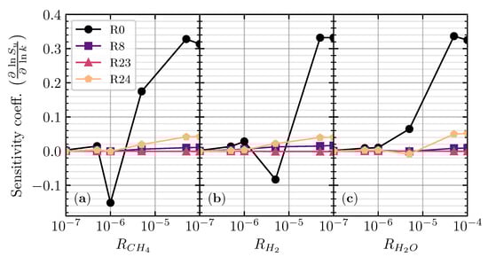 In Figure 3, the sensitivity coefficient of the top four essential elementary reactions is mostly near zero when in different hydrogenous species. When increases to (), the sensitivity coefficient of four reactions becomes fluctuating, indicating the change of the chemical scheme of CO oxidation. R0 becomes the most fluctuated reaction as the hydrogenous species starts to contribute to the production of H radicals from its decomposition, which later reacts with O2 from the air to produce OH radicals (R0). The produced OH radicals then reacted with CO (R24) as the significant reaction contributing to the production of CO2 [,]. R24 also starts to have a positive (promotion) sensitivity coefficient as the production mechanism for CO2 is shifted from dry CO oxidation (R23) to wet CO oxidation (R24). It is evidence that R23 stays near zero sensitivity coefficient on as R23 contributed less to the laminar flame speed. Increasing further, the sensitivity coefficients of R0 and R24 become more positive, while R23 is nearly unchanged.