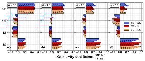 Sensitivity analysis of the laminar flame speed for CO/air flame at (a), (b), (c), and (d), respectively. The no hatch, forward slash (//), and backward slash () pattern represent , and , respectively.