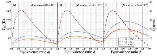 Adiabatic flame temperature (dashed line) and laminar flame speed (solid line) of premixed CO/air flames for (a), (b), and (c) as a function of equivalence ratio.