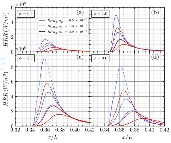 The effects of different hydrogenous species additions on the net heat release rate (HRR) were investigated. Since the effect of the H2 and H2O addition are identical, the results will focus on the comparison between the addition of CH4 and H2 in different and . Figure 6 shows the net heat release rate of the CH4 and H2 addition with respect to non-dimensional axial distance () ranging from 0 to 1. Four different equivalence ratios were chosen in order to observe different conditions, including lean (), stoichiometric (), maximum laminar flame speed (), and rich ) conditions.