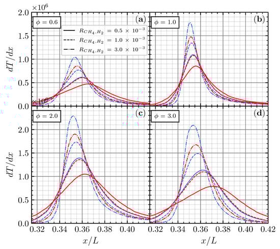 The increment of also affected the location of , which moves upstream in every equivalence ratio. These results are also confirmed with the identical distribution and location of the maximum temperature gradient , presented in Figure 7. usually defines the location of the flame front, representing the fast reaction zones []. Also, has a relation with the flame thickness () [] through the following equation: